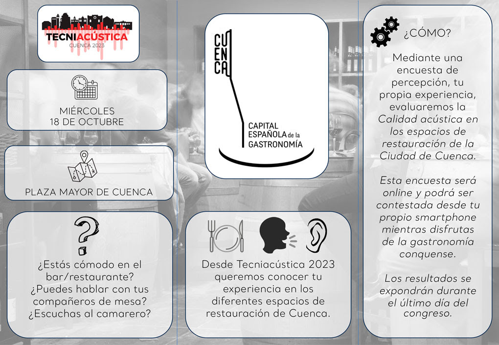 El objetivo reside en valorar, mediante una encuesta de percepción durante el desarrollo del congreso Tecniacústica-2023, la calidad acústica en espacios de restauración de la ciudad de Cuenca, declarada Capital Española de la Gastronomía-2023.